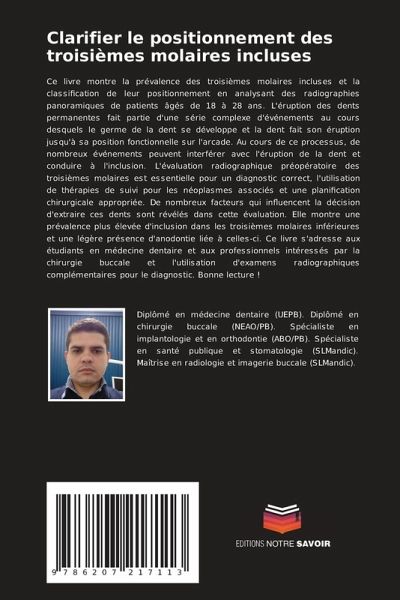 Ce livre montre la prévalence des troisièmes molaires incluses et la classification de leur positionnement en analysant des radiographies panoramiques de patients âgés de 18 à 28 ans. L'éruption des dents permanentes fait partie d'une série complexe d'événements au cours desquels le germe de la dent se développe et la dent fait son éruption jusqu'à sa position fonctionnelle sur l'arcade. Au cours de ce processus, de nombreux événements peuvent interférer avec l'éruption de la dent et conduire à l'inclusion. L'évaluation radiographique préopératoire des troisièmes molaires est essentielle pour un diagnostic correct, l'utilisation de thérapies de suivi pour les néoplasmes associés et une planification chirurgicale appropriée. De nombreux facteurs qui influencent la décision d'extraire ces dents sont révélés dans cette évaluation. Elle montre une prévalence plus élevée d'inclusion dans les troisièmes molaires inférieures et une légère présence d'anodontie liée à celles-ci. Ce livre s'adresse aux étudiants en médecine dentaire et aux professionnels intéressés par la chirurgie buccale et l'utilisation d'examens radiographiques complémentaires pour le diagnostic. Bonne lecture !