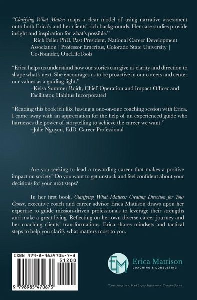 Are you seeking to lead a rewarding career that makes a positive impact on society? Do you want to get unstuck and feel confident about your decisions for your next steps? In her first book Clarifying What Matters: Creating Direction for Your Career, executive coach and career advisor Erica Mattison draws upon her expertise to guide mission-driven professionals to leverage their strengths and make a great living. Reflecting on her own diverse career journey and her coaching clients' transformations, Erica shares mindsets and tactical steps to help you clarify what matters most to you.