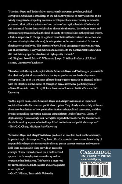 Corruption is a significant problem for democracies throughout the world. Even the most democratic countries constantly face the threat of corruption and the consequences of it at the polls. Why are some governments more corrupt than others, even after considering cultural, social, and political characteristics? In Clarity of Responsibility, Accountability, and Corruption, the authors argue that clarity of responsibility is critical for reducing corruption in democracies. The authors provide a number of empirical tests of this argument, including a cross-national time-series statistical analysis to show that the higher the level of clarity the lower the perceived corruption levels. Using survey and experimental data, the authors show that clarity causes voters to punish incumbents for corruption. Preliminary tests further indicate that elites respond to these electoral incentives and are more likely to combat corruption when clarity is high.