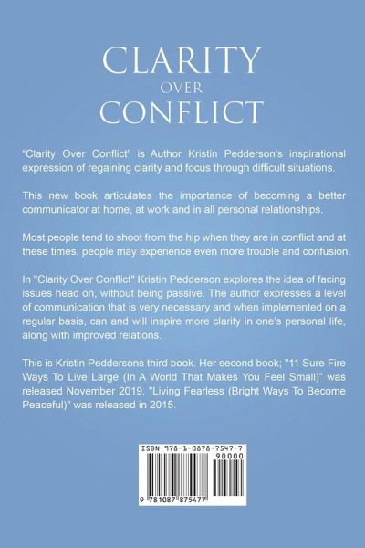 Clarity Over Conflict is author Kristin Pedderson's powerful guide to restoring focus and understanding during life's toughest moments. In this new book, Kristin highlights the importance of developing clear, effective communication in all areas of life-at home, at work, and in personal relationships. Many people react impulsively during conflicts, often leading to more confusion and frustration. In Clarity Over Conflict, Kristin encourages readers to confront challenges directly and with purpose, rather than avoiding them. She presents a communication approach that, when practiced regularly, brings greater clarity and strengthens personal connections. Clarity Over Conflict is Kristin Pedderson's third book. Her previous releases include 11 Surefire Ways to Live Large (In a World That Makes You Feel Small) (2019) and Living Fearless: Bright Ways to Become Peaceful (2015). About the Author: Kristin Pedderson Kristin Pedderson is a storyteller at heart, weaving together words that breathe life into the soul. With each book, she offers a glimpse into the depths of faith, hope, and personal transformation. Kristin's journey has been one of seeking truth, embracing vulnerability, and inspiring others to live with purpose and grace. Her writing reflects the beauty of a heart that is fully surrendered to God, drawing readers into a space of reflection, connection, and spiritual renewal. Kristin believes that through every challenge and triumph, we are guided to something greater, something higher-a life filled with love, light, and the quiet strength that comes from walking with God. The author, artist, music producer and speaker, is a passionate advocate for personal and spiritual growth. With a deep love for God and a desire to inspire others, Kristin writes with the intention of helping people find purpose, joy, and faith in their everyday lives. Her work reflects a commitment to uplifting and encouraging readers through faith-based reflections and insights.