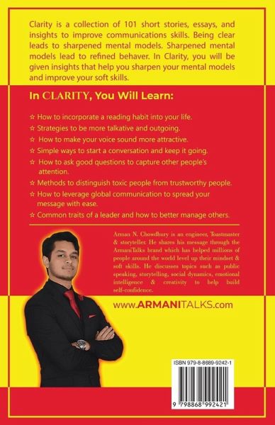 Clarity is a collection of 101 short stories, essays, and insights to improve communications skills. Being clear leads to sharpened mental models. Sharpened mental models lead to refined behaver. In Clarity, you will be given insights that help you sharpen your mental models and improve your soft skills. In Clarity, you will learn: How to incorporate a reading habit into your life. Strategies to be more talkative and outgoing. How to make your voice sound more attractive. Simple ways to start a conversation and keep it going. How to ask good questions to capture other people's attention. Methods to distinguish toxic people from trustworthy people. How to leverage global communication to spread your message with ease. Common traits of a leader and how to better manage others.