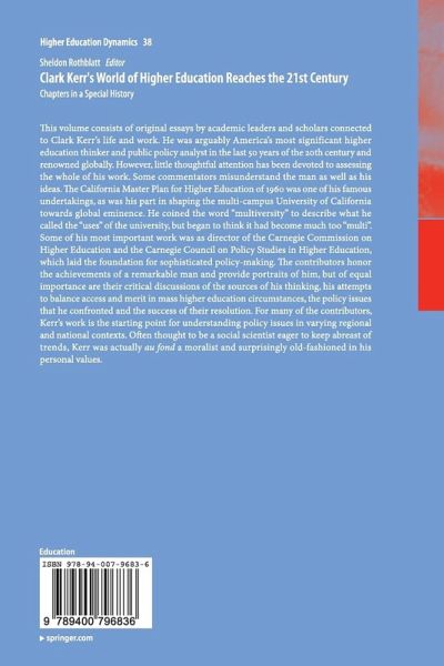 This volume consists of original essays by academic leaders and scholars connected to Clark Kerr's life and work. He was arguably America's most significant higher education thinker and public policy analyst in the last 50 years of the 20th century and renowned globally. However, little thoughtful attention has been devoted to assessing the whole of his work. Some commentators misunderstand the man as well as his ideas. The California Master Plan for Higher Education of 1960 was one of his famous undertakings, as was his part in shaping the multi-campus University of California towards global eminence. He coined the word "multiversity" to describe what he called the "uses" of the university, but began to think it had become much too "multi". Some of his most important work was as director of the Carnegie Commission on Higher Education and the Carnegie Council on Policy Studies in Higher Education, which laid the foundation for sophisticated policy-making. The contributors honor the achievements of a remarkable man and provide portraits of him, but of equal importance are their critical discussions of the sources of his thinking, his attempts to balance access and merit in mass higher education circumstances, the policy issues that he confronted and the success of their resolution. For many of the contributors, Kerr's work is the starting point for understanding policy issues in varying regional and national contexts. Often thought to be a social scientist eager to keep abreast of trends, Kerr was actually au fond a moralist and surprisingly old-fashioned in his personal values.