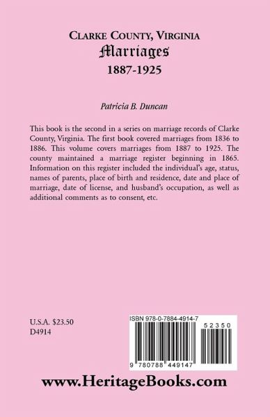 This book is the second in a series on marriage records of Clarke County, Virginia. The first book covered marriages from 1836 to 1886. This volume covers marriages from 1887 to 1925. The county maintained a marriage register beginning in 1865. Information on this register included the individual's age, status, names of parents, place of birth and residence, date and place of marriage, date of license, and husband's occupation, as well as additional comments as to consent, etc.