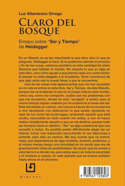 Luz Altamirano Orrego (1933). Se encuentra con Heidegger a la edad de 18 años a través de Sendas Perdidas. El deslumbramiento por este filósofo la lleva, siete años más tarde, a comenzar a estudiarlo regularmente con su amiga Carmen Echenique. Los textos revisados, entre otros, fueron: Ser y Tiempo; ¿Qué significa pensar?; Poéticamente habita el hombre; El habla; Construir, habitar, pensar; La técnica; Serenidad. En 1968 el profesor Jorge Eduardo Rivera les ofrece clases privadas durante dos años, para profundizar la obra fundamental de Heidegger, Ser y Tiempo. Posteriormente, en 1970, cursa la carrera de Licenciatura en Filosofía en la Universidad de Chile, y hace el curso del profesor Jorge Acevedo, especialista en Heidegger y destacado profesor universitario, que le ayudan a penetrar más en esta obra. Finalmente, en 2004 decide escribir el ensayo que aquí se presenta, buscando aproximar a las personas al pensamiento de Heidegger. Todavía sin intención de publicarlo, y tras mostrárselo a sus dos maestros, Jorge Eduardo Rivera y Humberto Giannini, ellos la instan a terminar esta obra. "Una verdadera joya", le expresó el Premio Nacional de Filosofía. Y agregó el profesor Rivera: "Luz, no le borraría ni una coma". Con este aliento lo finaliza y lo presenta años más tarde a Editorial Universitaria.