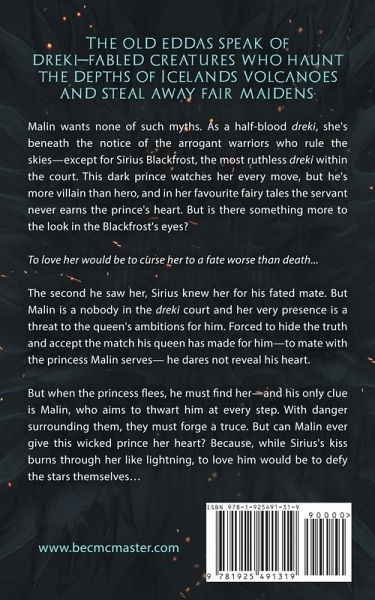 The old eddas speak of dreki—fabled creatures who haunt the depths of Iceland's volcanoes and steal away fair maidens. Malin wants none of such myths. As a half-blood dreki, she's beneath the notice of the arrogant warriors who rule the skies—except for Sirius Blackfrost, the most ruthless dreki within the court. This dark prince watches her every move, but he's more villain than hero, and in her favourite fairy tales the servant never earns the prince's heart. But is there something more to the look in the Blackfrost's eyes? To love her would be to curse her to a fate worse than death... The second he saw her, Sirius knew her for his fated mate. But Malin is a nobody in the dreki court and her very presence is a threat to the queen's ambitions for him. Forced to hide the truth and accept the match his queen has made for him—to mate with the princess Malin serves— he dares not reveal his heart. But when the princess flees, he must find her—and his only clue is Malin, who aims to thwart him at every step. With danger surrounding them, they must forge a truce. But can Malin ever give this wicked prince her heart? Because, while Sirius's kiss burns through her like lightning, to love him would be to defy the stars themselves…
