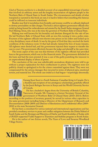 Clash of Justice and Tyranny is a detailed account of an unparalleled miscarriage of justice that involved an arbitrary arrest and the lengthy incarceration of eighteen people in the Northern Bahr el Ghazal State in South Sudan. The circumstances and details of what transpired as narrated in this book are rare; it is hard to believe that something this heinous could be inflicted on innocent individuals. Readers may find it incredulous how brutality and tyranny could be so callously deployed to destroy personalities on false charges. The book is about eighteen government officials who ended up being framed for embezzlement and arrested by the South Sudan strongman General Paul Malong Awan, who was at the time the governor of Northern Bahr el Ghazal State. Malong was well known for his brutality and absolute disregard for the rule of law. He led Northern Bahr el Ghazal State with an iron fist, turning it into a police state. Fourteen of the eighteen officials were thrown into prison on his orders and locked up in a tiny disciplinary room of death. It was by the grace of God that they survived the harsh conditions of the infamous room 11 that had already claimed the lives of many inmates. All eighteen were denied bail, and the government rejected their request to transfer the case to court. The government effectively became the judge and plaintiff at the same time. The ironic aspect of the case was that thirteen of the eighteen officials had provided loan to the government, which was in dire financial straits. The government defaulted on the loans and had the men arrested. It was a case of the guilty punishing the innocent in an unprecedented display of abuse of power. The conclusion of the case was unbelievably anomalous; detainees were told to go without a proper explanation for their confinement in prison. The eighteen were not publicly cleared or apologized to for the crimes committed against them. They were not compensated for the serious damages they incurred in terms of physical pain, emotional torture, and material loss. The whole case ended as it had begun-surprisingly abnormally.