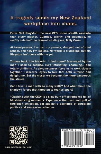 A tragedy sends my New Zealand workplace into chaos. Enter Neil Kingston: the new CEO, more stealth assassin than stuffy bigshot. Guarded, prickly, and enigmatic, he swiftly cuts half the team-including me, Milly Cross. At twenty-seven, I've lost my parents, dropped out of med school, and now I'm jobless. My world is crumbling, but Mr. Kingston isn't done with me yet. Thrown back into his orbit, I find myself fascinated by the man I used to despise. He's infuriating, charming... and totally off-limits. As circumstances force us to work closely together, I discover layers to Neil that both surprise and delight me. But the closer we become, the more dangerous the stakes. Can I trust a man with so many walls? And what about the shadowy forces that threaten to tear us apart? "Clashing with the CEO" is a slow-burn office romance full of blush-inducing moments. Experience the push and pull of forbidden attraction, set against a backdrop of corporate politics and succession schemes.
