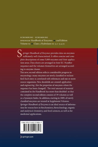 Springer Handbook of Enzymes provides data on enzymes sufficiently well characterized. It offers concise and complete descriptions of some 5,000 enzymes and their application areas. Data sheets are arranged in their EC-Number sequence and the volumes themselves are arranged according to enzyme classes.
