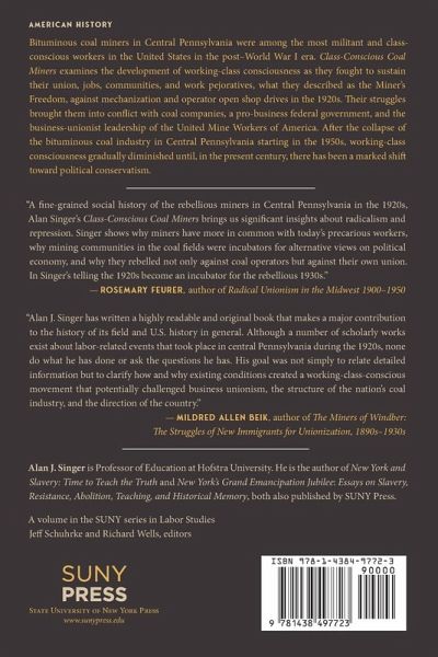 Bituminous coal miners in Central Pennsylvania were among the most militant and class-conscious workers in the United States in the post-World War I era. Class-Conscious Coal Miners examines the development of working-class consciousness as they fought to sustain their union, jobs, communities, and work pejoratives, what they described as the Miner's Freedom, against mechanization and operator open shop drives in the 1920s. Their struggles brought them into conflict with coal companies, a pro-business federal government, and the business-unionist leadership of the United Mine Workers of America. After the collapse of the bituminous coal industry in Central Pennsylvania starting in the 1950s, working-class consciousness gradually diminished until, in the present century, there has been a marked shift toward political conservatism.