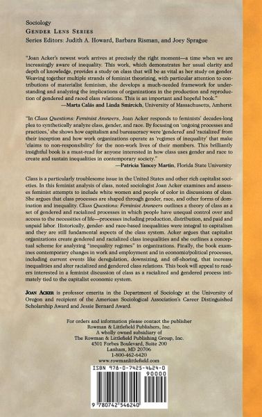 Class Questions: Feminist Answers examines feminist theories of class and intersectionality and proposes a theory of gendered and racialized class processes as deeply embedded in capitalist practices, both historically and today. Joan Acker argues that large work organizations are primary locations in which gendered and racialized class inequalities are created. As neo-liberal market practices reorganize work, gendered and racialized class inequalities are both reorganized and increasing nationally and globally. This book will appeal to readers interested in a feminist discussion of class as a racialized and gendered process intimately tied to the capitalist economic system.