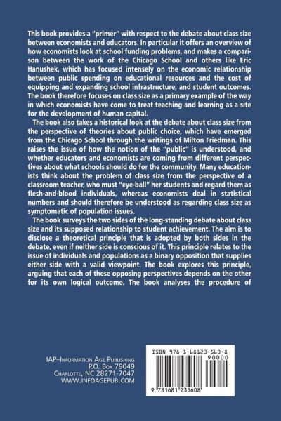 This book provides a "primer" with respect to the debate about class size between economists and educators. In particular it offers an overview of how economists look at school funding problems, and makes a comparison between the work of the Chicago School and others like Eric Hanushek, which has focused intensely on the economic relationship between public spending on educational resources and the cost of equipping and expanding school infrastructure, and student outcomes. The book therefore focuses on class size as a primary example of the way in which economists have come to treat teaching and learning as a site for the development of human capital. The book also takes a historical look at the debate about class size from the perspective of theories about public choice, which have emerged from the Chicago School through the writings of Milton Friedman. This raises the issue of how the notion of the "public" is understood, and whether educators and economists are coming from different perspectives about what schools should do for the community. Many educationists think about the problem of class size from the perspective of a classroom teacher, who must "eyeball" her students and regard them as flesh¿and¿blood individuals, whereas economists deal in statistical numbers and should therefore be understood as regarding class size as symptomatic of population issues. The book surveys the two sides of the long¿standing debate about class size and its supposed relationship to student achievement. The aim is to disclose a theoretical principle that is adopted by both sides in the debate, even if neither side is conscious of it. This principle relates to the issue of individuals and populations as a binary opposition that supplies either side with a valid viewpoint. The book explores this principle, arguing that each of these opposing perspectives depends on the other for its own logical outcome. The book analyses the procedure of opposing individuals to populations and demonstrates that the question of class size could be more effectively approached by dealing with the principle that is at its core.
