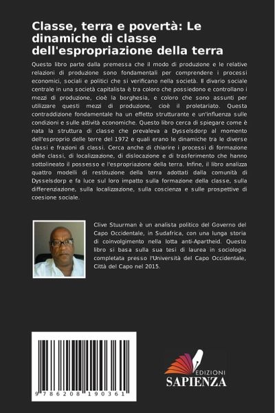 Questo libro parte dalla premessa che il modo di produzione e le relative relazioni di produzione sono fondamentali per comprendere i processi economici, sociali e politici che si verificano nella società. Il divario sociale centrale in una società capitalista è tra coloro che possiedono e controllano i mezzi di produzione, cioè la borghesia, e coloro che sono assunti per utilizzare questi mezzi di produzione, cioè il proletariato. Questa contraddizione fondamentale ha un effetto strutturante e un'influenza sulle condizioni e sulle attività economiche. Questo libro cerca di spiegare come è nata la struttura di classe che prevaleva a Dysselsdorp al momento dell'esproprio delle terre del 1972 e quali erano le dinamiche tra le diverse classi e frazioni di classi. Cerca anche di chiarire i processi di formazione delle classi, di localizzazione, di dislocazione e di trasferimento che hanno sottolineato il possesso e l'espropriazione della terra. Infine, il libro analizza quattro modelli di restituzione della terra adottati dalla comunità di Dysselsdorp e fa luce sul loro impatto sulla formazione della classe, sulla differenziazione, sulla localizzazione, sulla coscienza e sulle prospettive di coesione sociale.