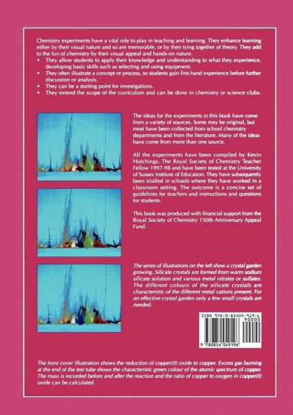 Chemistry experiments have a vital role to play in teaching and learning. They enhance learning either by their visual nature and so are memorable, or by their tying together of theory. They add to the fun of chemistry by their visual appeal and hands-on nature. - They allow students to apply their knowledge and understanding to what they experience, developing basic skills such as selecting and using equipment - They often illustrate a concept or process, so students gain first-hand experience before further discussion or analysis - They can be a starting point for investigations - They extend the scope of the curriculum and can be done in chemistry or science clubs The ideas for the experiments in this book have come from a variety of sources. Some may be original, but most have been collected from school chemistry departments and from the literature. Many of the ideas have come from more than one source. All the experiments have been compiled by Kevin Hutchings, The Royal Society of Chemistry Teacher Fellow 1997-98, and have been tested at the University of Sussex Institute of Education. They have subsequently been trialled in schools where they have worked in a classroom setting. The outcome is a concise set of guidelines for teachers and instructions and questions for students.