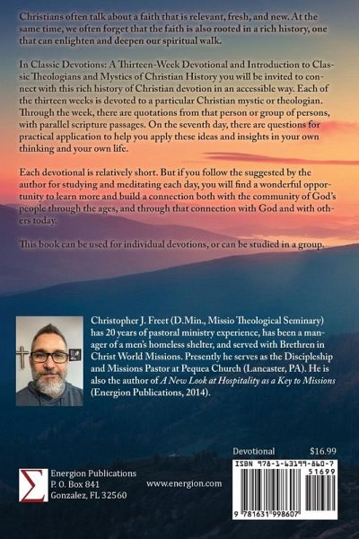 Christians often talk about a faith that is relevant, fresh, and new. At the same time, we often forget that the faith is also rooted in a rich history, one that can enlighten and deepen our spiritual walk. In Classic Devotions: A Thirteen-Week Devotional and Introduction to Classic Theologians and Mystics of Christian History you will be invited to connect with this rich history of Christian devotion in an accessible way. Each of the thirteen weeks is devoted to a particular Christian mystic or theologian. Through the week, there are quotations from that person or group of persons, with parallel scripture passages. On the seventh day, there are questions for practical application to help you apply these ideas and insights in your own thinking and your own life. Each devotional is relatively short. But if you follow the suggested by the author for studying and meditating each day, you will find a wonderful opportunity to learn more and build a connection both with the community of God's people through the ages, and through that connection with God and with others today. This book can be used for individual devotions, or can be studied in a group.