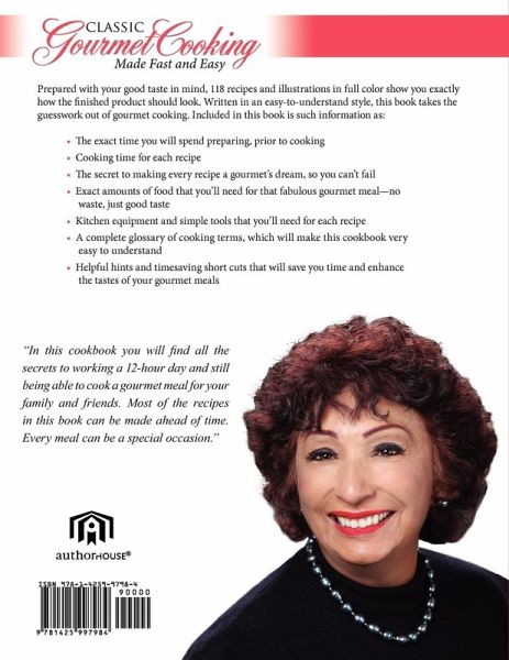 Prepared with your good taste in mind, 118 recipes and illustrations in full color show you exactly how the finished product should look. Written in an easy-to-understand style, this book takes the guesswork out of gourmet cooking. Included in this book is such information as: · The exact time you will spend preparing, prior to cooking · Cooking time for each recipe · The secret to making every recipe a gourmet's dream, so you can't fail · Exact amounts of food that you'll need for that fabulous gourmet meal-no waste, just good taste. · Kitchen equipment and simple tools that you'll need for each recipe · A complete glossary of cooking terms, which will make this cookbook very easy to understand · Helpful hints and timesaving short cuts that will save you time and enhance the tastes of your gourmet meals