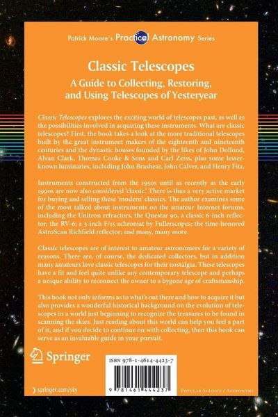 "Part of Patrick Moore's Practical Astronomy Series ... Classic Telescopes approaches the topic from a skilled collectors and telescope operators perspective. The focus is primarily on refractors of yesteryear, with a scattering of reflectors from the past century thrown in. ... Classic Telescopes is an indispensable reference resource for anyone refurbishing or hunting for a piece of astronomical history. Interspersed with expert reviews and great close-up pics, this guide provides a unique insight into a fascinating branch of optics and astronomy." (David Dickinson, Astro Guyz, November, 2012)
