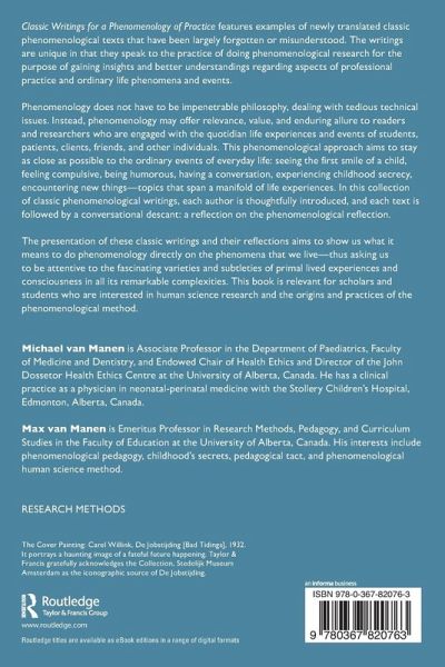 Classic Writings for a Phenomenology of Practice features examples of newly translated classic phenomenological texts that have been largely forgotten or misunderstood. The writings are unique in that they speak to the practice of doing phenomenological research for the purpose of gaining insights and better understandings regarding aspects of professional practice and ordinary life phenomena and events.