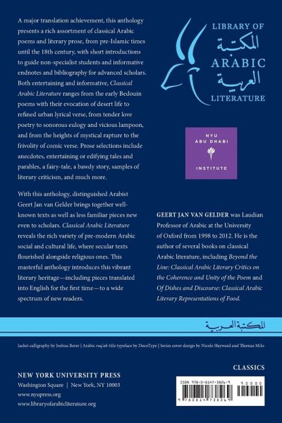 A major translation achievement, this anthology presents a rich assortment of classical Arabic poems and literary prose, from pre-Islamic times until the eighteenth century, with short introductions to guide non-specialist students and informative endnotes and bibliography for advanced scholars. Both entertaining and informative, Classical Arabic Literature ranges from the early Bedouin poems with their evocation of desert life to refined urban lyrical verse, from tender love poetry to sonorous eulogy and vicious lampoon, and from the heights of mystical rapture to the frivolity of comic verse. Prose selections include anecdotes, entertaining or edifying tales and parables, a fairy-tale, a bawdy story, samples of literary criticism, and much more. With this anthology, distinguished Arabist Geert Jan van Gelder brings together well-known texts as well as less familiar pieces new even to scholars. Classical Arabic Literature reveals the rich variety of pre-modern Arabic social and cultural life, where secular texts flourished alongside religious ones. This masterful anthology introduces this vibrant literary heritage-including pieces translated into English for the first time-to a wide spectrum of new readers. An English-only edition.