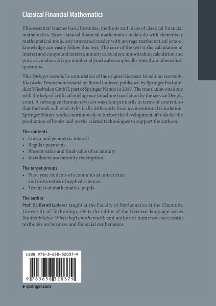 This essential teaches basic formulas, methods and ideas of classical financial mathematics. Since classical financial mathematics makes do with elementary mathematical tools, any interested reader with average mathematical school knowledge can easily follow this text. The core of the text is the calculation of interest and compound interest, annuity calculation, amortization calculation and price calculation. A large number of practical examples illustrate the mathematical questions.