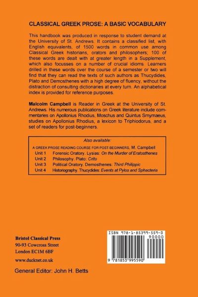 This handbook contains a classified list, with English equivalents, of 1500 words in common use among classical Greek historians, orators and philosophers. The aim of the book is to enable learners to read the texts of such authors as Thucydides, Plato and Demosthenes with a high degree of fluency.