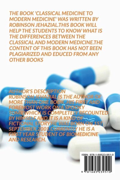 The book"CLASSICAL MEDICINE TO MODERN MEDICINE"helps the readers to understand what does mean by medical science and what are the differences between the classical medicine and modern medicine.As well,the content of this book helps the readers to make a review on the field of ancient medicine and also it depicts that how the people on the globe have changed their unique way of approach to the modern medicine.It is completely recounted by the author.Author wants the readers to know what are the basic differences in the field of medicine and he does not have intention to discriminate the field of medicine.The content does not resemble any person or practitioners;if he/she starts to protest against the content of this book,author would never like to apologize and he is not the responsibility for any kind of disputes.