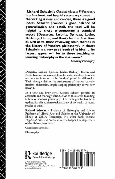 Descartes, Leibniz, Spinoza, Locke, Berkeley, Hume, and Kant: these are the seven philosophers who stand out from the rest in what is known as the `modern' period in philosophy. Their thought defines the mainstream of classical or early modern philosophy, largely responsible for shaping philosophy as we now know it. In a clear and lively style, Richard Schacht has written a thorough introduction to the work of these seven founding fathers of modern philosophy. The bibliography has been updated for this revised edition to take account of the recent explosion of writings on modern philosophy.