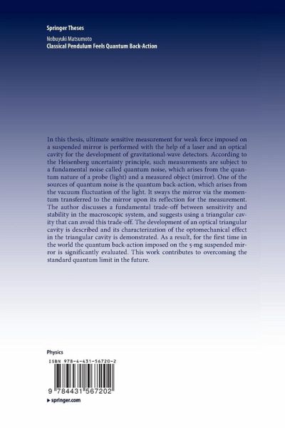 In this thesis, ultimate sensitive measurement forweak force imposed on a suspended mirror is performed with the help of a laserand an optical cavity for the development of gravitational-wave detectors.According to the Heisenberg uncertainty principle, such measurements aresubject to a fundamental noise called quantum noise, which arises from thequantum nature of a probe (light) and a measured object (mirror). One of thesources of quantum noise is the quantum back-action, which arises from thevacuum fluctuation of the light. It sways the mirror via the momentumtransferred to the mirror upon its reflection for the measurement. The authordiscusses a fundamental trade-off between sensitivity and stability in themacroscopic system, and suggests using a triangular cavity that can avoid thistrade-off. The development of an optical triangular cavity is described and itscharacterization of the optomechanical effect in the triangular cavity isdemonstrated. As a result, for the first time in the world the quantum back-actionimposed on the 5-mg suspended mirror is significantly evaluated. This workcontributes to overcoming the standard quantum limit in the future.