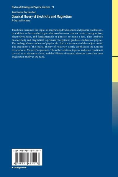 This book examines the topics of magnetohydrodynamics and plasma oscillations, in addition to the standard topics discussed to cover courses in electromagnestism, electrodynamics, and fundamentals of physics, to name a few. This textbook on electricity and magnetism is primarily targeted at graduate students of physics. The undergraduate students of physics also find the treatment of the subject useful. The treatment of the special theory of relativity clearly emphasises the Lorentz covariance of Maxwell's equations. The rather abstruse topic of radiation reaction is covered at an elementary level, and the Wheeler-Feynman absorber theory has been dwelt upon briefly in the book.