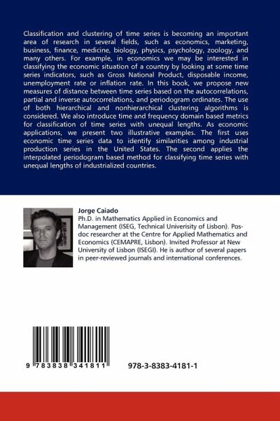 Classification and clustering of time series is becoming an important area of research in several fields, such as economics, marketing, business, finance, medicine, biology, physics, psychology, zoology, and many others. For example, in economics we may be interested in classifying the economic situation of a country by looking at some time series indicators, such as Gross National Product, disposable income, unemployment rate or inflation rate. In this book, we propose new measures of distance between time series based on the autocorrelations, partial and inverse autocorrelations, and periodogram ordinates. The use of both hierarchical and nonhierarchical clustering algorithms is considered. We also introduce time and frequency domain based metrics for classification of time series with unequal lengths. As economic applications, we present two illustrative examples. The first uses economic time series data to identify similarities among industrial production series in the UnitedStates. The second applies the interpolated periodogram based method for classifying time series with unequal lengths of industrialized countries.