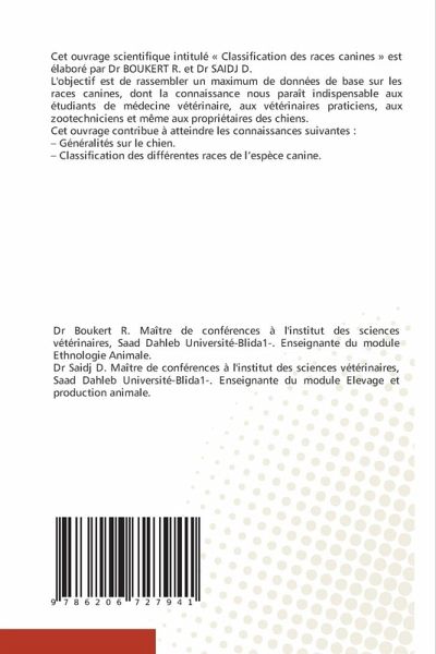 Cet ouvrage scientifique intitulé « Classification des races canines » est élaboré par Dr BOUKERT R. et Dr SAIDJ D. L'objectif est de rassembler un maximum de données de base sur les races canines, dont la connaissance nous paraît indispensable aux étudiants de médecine vétérinaire, aux vétérinaires praticiens, aux zootechniciens et même aux propriétaires des chiens.Cet ouvrage contribue à atteindre les connaissances suivantes :- Généralités sur le chien.- Classification des différentes races de l'espèce canine.