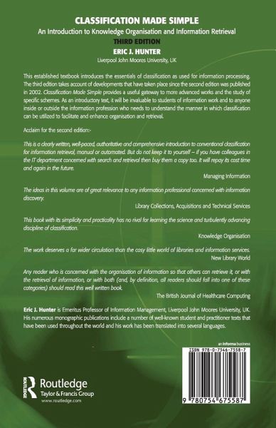 This established textbook introduces the essentials of classification as used for information processing. The third edition takes account of developments that have taken place since the second edition was published in 2002. Classification Made Simple provides a useful gateway to more advanced works and the study of specific schemes. As an introductory text, it will be invaluable to students of information work and to anyone inside or outside the information profession who needs to understand the manner in which classification can be utilized to facilitate and enhance organisation and retrieval.