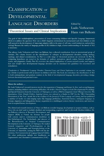 Contents: W.J.M. Levelt, Preface. L. Verhoeven, H. van Balkom, Introduction: Developmental Language Disorders: Classification, Assessment, and Intervention. Part I: Etiology. N. Botting, G. Conti-Ramsden, Characteristics of Children With Specific Language Impairment. J. Reilly, J. Weckerly, B. Wulfeck, Neuroplasticity and Development: The Acquisition of Morphosyntax in Children With Early Focal Lesions and Children With Specific Language Impairment. P.H. Been, F. Zwarts, Language Disorders Across Modalities: The Case of Developmental Dyslexia. P.H.T. Leppänen, H. Lyytinen, N. Choudbury, A.A. Benasich, Neuroimaging Measures in the Study of Specific Language Impairment. R.B. Gillam, L.M. Hoffman, Information Processing in Children With Specific Language Impairment. S. Goorhuis-Brouwer, F. Coster, H. Nakken, H.L. Spelberg, Environmental Factors in Developmental Language Disorders. Part II: Typology. B. Maassen, Speech Output Disorders. J. Katz, K. Tillery, Central Auditory Processing. L.B. Leonard, P. Deevy, Lexical Deficits in Specific Language Impairment. D. Ravid, R. Levie, G.A. Ben-Zvi, Morphological Disorders. J. de Jong, Grammatical Impairment: An Overview and a Sketch of Dutch. H. van Balkom, L. Verhoeven, Pragmatic Disability in Children With Specific Language Impairments. Part III: Assessment and Intervention. D.V.M. Bishop, Specific Language Impairment: Diagnostic Dilemmas. P. van Geert, A Dynamic Systems Approach to Diagnostic Measurement of SLI. H. de Ridder, H. van der Stege, Early Detection of Developmental Language Disorders. S.F. Warren, P.J. Yoder, Early Intervention for Young Children With Language Impairments. L. Verhoeven, E. Segers, Benefits of Speech Manipulation for Children With Language Disorders. J. Law, The Close Association Between Classification and Intervention for Children With Primary Language Impairments.