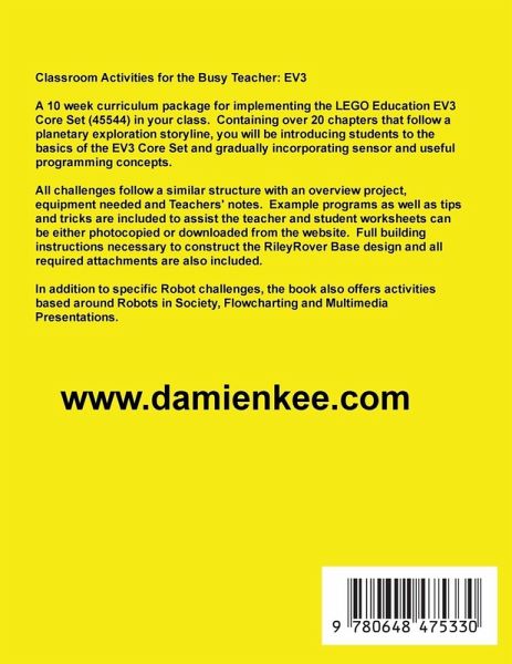 Classroom Activities for the Busy Teacher: EV3 A 10 week curriculum package for implementing the LEGO Education EV3 Core Set (45544) in your class. Containing over 20 chapters that follow a planetary exploration storyline, you will be introducing students to the basics of the EV3 Core Set and gradually incorporating sensor and useful programming concepts. All challenges follow a similar structure with an overview project, equipment needed and Teachers' notes. Example programs as well as tips and tricks are included to assist the teacher and student worksheets can be either photocopied or downloaded from the website. Full building instructions necessary to construct the RileyRover Base design and all required attachments are also included. In addition to specific Robot challenges, the book also offers activities based around Robots in Society, Flowcharting and Multimedia Presentations.