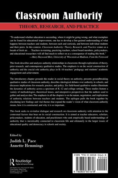 This book describes and analyzes authority relationships in classrooms through explorations of theory, prior research, and contemporary qualitative studies. The emphasis is on the social construction of authority and the crucial role authority plays in K-16 teachers' pedagogy and students' academic engagement and achievement. The introductory chapter grounds the reader in social theory on authority; presents groundbreaking qualitative studies of classroom authority; describes ideological debates over authority in schools; and discusses implications for research, practice, and policy. Six field-based qualitative studies illuminate the dynamics of authority across a spectrum of K-12 and college settings. These studies feature a variety of methodologies, theoretical lenses, and interpretive perspectives that the authors use to gather and analyze data. The emphasis in all the chapters is on the nature, negotiation, and implications of authority relations between teachers and students. The epilogue pulls the book together by elucidating new findings and vital themes that expand the reader's vision of what classroom authority means, how it is constructed, and why it is so important. This book seeks to revitalize dialogue and research on classroom authority with attention to the contextual factors that bear on its social construction. It is aimed at teacher educators, scholars, policymakers, students of education, and practitioners who seek empirically based understanding of authority that is inextricably connected to classroom life and ultimately to the larger issues of educational quality and democracy in schools and society.
