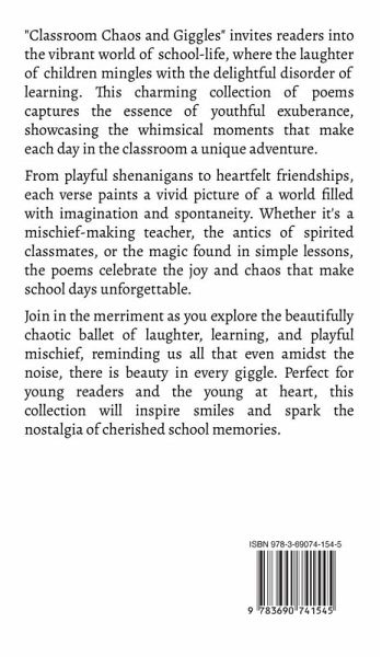 "Classroom Chaos and Giggles" invites readers into the vibrant world of school-life, where the laughter of children mingles with the delightful disorder of learning. This charming collection of poems captures the essence of youthful exuberance, showcasing the whimsical moments that make each day in the classroom a unique adventure. From playful shenanigans to heartfelt friendships, each verse paints a vivid picture of a world filled with imagination and spontaneity. Whether it's a mischief-making teacher, the antics of spirited classmates, or the magic found in simple lessons, the poems celebrate the joy and chaos that make school days unforgettable. Join in the merriment as you explore the beautifully chaotic ballet of laughter, learning, and playful mischief, reminding us all that even amidst the noise, there is beauty in every giggle. Perfect for young readers and the young at heart, this collection will inspire smiles and spark the nostalgia of cherished school memories.