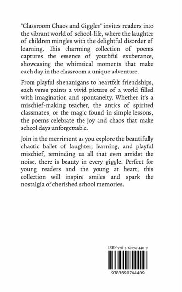 "Classroom Chaos and Giggles" invites readers into the vibrant world of school-life, where the laughter of children mingles with the delightful disorder of learning. This charming collection of poems captures the essence of youthful exuberance, showcasing the whimsical moments that make each day in the classroom a unique adventure. From playful shenanigans to heartfelt friendships, each verse paints a vivid picture of a world filled with imagination and spontaneity. Whether it's a mischief-making teacher, the antics of spirited classmates, or the magic found in simple lessons, the poems celebrate the joy and chaos that make school days unforgettable. Join in the merriment as you explore the beautifully chaotic ballet of laughter, learning, and playful mischief, reminding us all that even amidst the noise, there is beauty in every giggle. Perfect for young readers and the young at heart, this collection will inspire smiles and spark the nostalgia of cherished school memories.