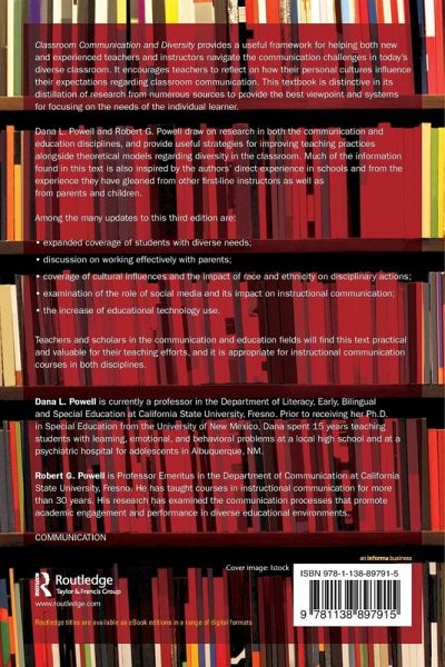 Classroom Communication and Diversity provides a useful framework for helping both new and experienced teachers and instructors navigate the communication challenges in today's diverse classroom. It encourages teachers to reflect on how their personal cultures influence their expectations regarding classroom communication. This textbook is distinctive in its distillation of research from numerous sources to provide the best viewpoint and systems for focusing on the needs of the individual learner. Dana L. Powell and Robert G. Powell draw on research in both the communication and education disciplines, and provide useful strategies for improving teaching practices alongside theoretical models regarding diversity in the classroom. Much of the information found in this text is also inspired by the authors' direct experience in schools and from the experience they have gleaned from other first-line instructors as well as from parents and children. Among the many updates to this Third Edition are: Expanded coverage of students with diverse needs Discussion on working effectively with parents Coverage of cultural influences and the impact of race and ethnicity on disciplinary actions Examination of the role of social media and its impact on instructional communication The increase of educational technology use. Teachers and scholars in the communication and education fields will find this text practical and valuable for their teaching efforts, and it is appropriate for instructional communication courses in both disciplines.