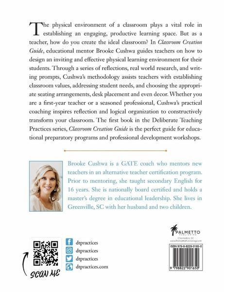 The physical environment of a classroom plays a vital role in establishing an engaging, productive learning space. But as a teacher, how do you create the ideal classroom? In Classroom Creation Guide, educational mentor Brooke Cushwa guides teachers on how to design an inviting and effective physical learning environment for their students. Through a series of reflections, real world research, and writing prompts, Cushwa's methodology assists teachers with establishing classroom values, addressing student needs, and choosing the appropriate seating arrangements, desk placement and even decor. Whether you are a first-year teacher or a seasoned professional, Cushwa's practical coaching inspires reflection and logical organization to constructively transform your classroom. The first book in the Deliberate Teaching Practices series, Classroom Creation Guide is the perfect guide for individualized professional development, educational preparatory programs, and professional development workshops.