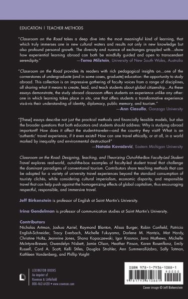 Classroom on the Road: Designing, Teaching, and Theorizing Out-of-the-Box Faculty-Led Student Travel explores real-world, out-of-the-box examples of faculty-led student travel that challenge the dominant paradigms of conventional tourism. Contributors share teaching methods that can be adapted for a variety of university travel scenarios and encourage students to be responsible and thoughtful members of the global community who seek out valuable experiences in other cultures to go beyond the standard consumption of touristy clichés. Furthermore, this book contributes to existing discourse about travel by going beyond being "just" a tourist to become a person who impacts—and is impacted by—other cultures and the commensurate politics of place. Contributors discuss issues of cultural imperialism, economic disparity, and responsible travel that can help protect unique destinations from the homogenizing effects of global capitalism, encouraging respectful and responsible travel.
