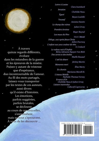 À travers quinze regards différents, évoluez dans les méandres de la guerre et les épreuves de la misère, et puisez-y autant de tristesse que d'espérance, duo incontournable de l'amour. Au fil des mots partagés, laissez-vous transporter par les textes de ces auteurs, aussi divers qu'il existe d'histoires. Les émotions, parfois suggérées, parfois brutales se déclinent au cours de ces nouvelles, s'entremêlent, mais surtout s'éprouvent. À vous de les découvrir...