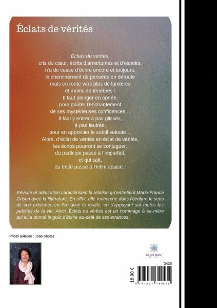 Éclats de vérités, cris du c¿ur, écrits d¿amertumes et d¿espoirs, n¿a de cesse d¿écrire encore et toujours, le cheminement de pensées en déroute mais en route vers plus de lumières et moins de ténèbres ! Il faut plonger en apnée, pour goûter l¿enchantement de ses mystérieuses confidences¿ Il faut y entrer à pas glissés, à pas feutrés, pour en apprécier le subtil velouté¿ Alors, d¿éclat de vérités en éclat de vérités, les échos pourront se conjuguer, du participe passé à l¿imparfait, et qui sait, du triste passé à l¿infini apaisé !