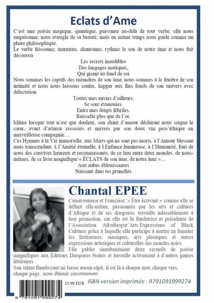 C'est une poésie magique, quantique, puissante au-delà de tout verbe, elle nous emprisonne, nous aveugle de sa beauté, mais en même temps nous guide comme un phare philosophique. Le verbe frissonne, murmure, chantonne, rythme le son de notre âme et nous fait découvrir Les secrets inaudibles Des langages mutiques, Qui gisent au fond de soi Nous sommes les captifs des méandres de son âme, nous sommes à la fenêtre de son intimité et nous nous laissons couler, happer aux fins fonds de son univers avec délectation Toutes mes envies d'ailleurs, Se sont évanouies. Entre mes doigts fébriles, Ruisselle plus que de l'or. Même lorsque tout n'est que douleur, son chant d'amour déchirant nous soigne le coeur, avant d'atterrir rassasiés et enivrés par son doux vin pros'éthique en merveilleuse compagnie... Ces Hymnes à la Vie immortelle, aux Morts qui ne sont pas morts, à l'Amour blessant mais transcendant, à l'Amitié éternelle, à l'Enfance lumineuse, à l'Humanité, font de nous des convives heureux et reconnaissants, de ce lieu entre deux mondes, de nous-mêmes, de ce livre magnifique " éclats de son âme, de notre âme "... Aux aubes éblouissantes Naissant dans tes prunelles