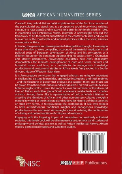 Claude E. Ake, radical African political philosopher of the first four decades of the postcolonial era, stands out as a progressive social force whose writings continue to have appeal and relevance long after his untimely death in 1996. In examining Ake's intellectual works, Jeremiah O. Arowosegbe sets out the framework of his theoretical orientations in the context of his life, and reveals him as one of the most fertile and influential voices within the social sciences community in Africa. In tracing the genesis and development of Ake's political thought, Arowosegbe draws attention to Ake's compelling account of the material implications and political costs of European colonisation of Africa and his conception of a different future for the continent. Approaching his subject from a Gramscian and Marxist perspective, Arowosegbe elucidates how Ake's philosophy demonstrates the intimate entanglement of class and social, cultural and historical issues, and how, as a contributor to endogenous knowledge production and postcolonial studies on Africa, Ake is firmly rooted in a South-driven critique of Western historicism. It is Arowosegbe's conviction that engaged scholars are uniquely important in challenging existing hierarchies, oppressive institutions, and truth regimes - and the structures of power that produce and support them; and much can be drawn from their contributions and failings alike. This work contributes to a hitherto neglected focus area: the impact across the continent of the ideas and lives of African and other global South academics, intellectuals and scholar-activists. Among them, Ake is representative of bold scholarly initiatives in asserting the identities of African and other non-Western cultures through a mindful rewriting of the intellectual and nationalist histories of these societies on their own terms. In foregrounding the contribution of Ake with respect to both autochthonous traditional insights and endogenous knowledge production on the continent, Arowosegbe aims at fostering the continuance of a living and potent tradition of critique and resistance. Engaging with the lingering impact of colonialism on previously colonised societies, this timely book will be of immense value to scholars and students of philosophy and political science as well as African intellectual history, African studies, postcolonial studies and subaltern studies.