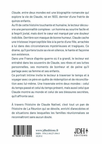 Claude, entre deux mondes est une biographie romancée qui explore la vie de Claude, né en 1933, dernier d¿une fratrie de quinze enfants. Au fil de cette histoire touchante et humaine, le lecteur découvre une personnalité complexe : un homme au sourire facile et à l¿esprit jovial, mais dont le c¿ur est marqué par une douleur indicible. Derrière son masque de bonne humeur, Claude cache une tristesse imperceptible liée à la perte d¿une fille, arrachée à lui dans des circonstances mystérieuses et tragiques. Ce drame, qüil portera toute sa vie en silence, le hante et façonne son existence. Dans une France d¿après-guerre où il a grandi, le lecteur est entraîné dans les souvenirs de Claude, ses rêves et ses luttes personnelles, ses moments de bonheur et de peine qüil partage avec sa femme et ses enfants. Ce portrait intime invite le lecteur à traverser le temps et à voyager avec ce père en quête de rédemption et de réconciliation avec lui-même. Une traversée entre deux mondes : celui du temps passé et celui du temps présent, mais aussi celui que Claude montre au monde et celui de ses blessures secrètes, qüil affronte seul. À travers l¿histoire de Claude Nativel, c¿est tout un pan de l¿histoire de La Réunion qui se dévoile, enrichi d¿anecdotes et de situations dans lesquelles les familles réunionnaises se reconnaîtront sans aucun doute.