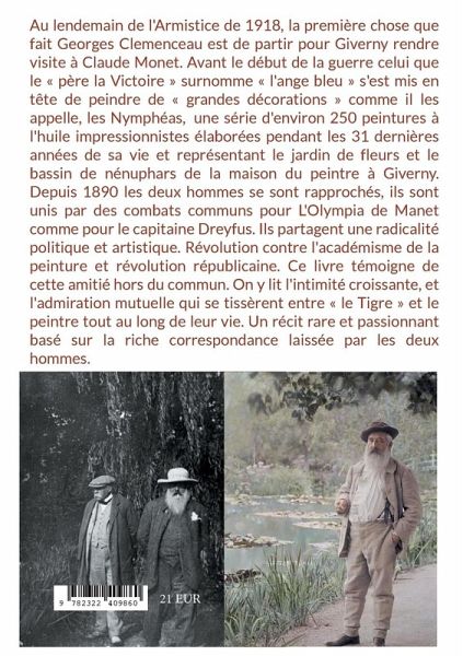 Au lendemain de l'Armistice de 1918, la première chose que fait Georges Clemenceau est de partir pour Giverny rendre visite à Claude Monet. Avant le début de la guerre celui que le « père la Victoire » surnomme « l'ange bleu » s'est mis en tête de peindre de « grandes décorations » comme il les appelle, les Nymphéas, une série d'environ 250 peintures à l'huile impressionnistes élaborées pendant les 31 dernières années de sa vie et représentant le jardin de fleurs et le bassin de nénuphars de la maison du peintre à Giverny. Depuis 1890 les deux hommes se sont rapprochés, ils sont unis par des combats communs pour L'Olympia de Manet comme pour le capitaine Dreyfus. Ils partagent une radicalité politique et artistique. Révolution contre l'académisme de la peinture et révolution républicaine. Ce livre témoigne de cette amitié hors du commun. On y lit l'intimité croissante, et l'admiration mutuelle qui se tissèrent entre « le Tigre » et le peintre tout au long de leur vie. Un récit rare et passionnant basé sur la riche correspondance laissée par les deux hommes.
