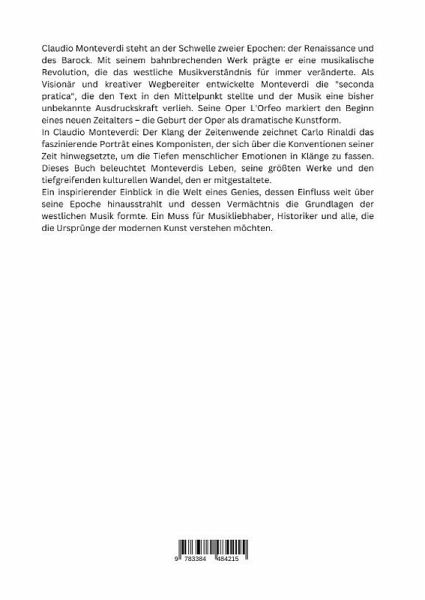 Claudio Monteverdi steht an der Schwelle zweier Epochen: der Renaissance und des Barock. Mit seinem bahnbrechenden Werk prägte er eine musikalische Revolution, die das westliche Musikverständnis für immer veränderte. Als Visionär und kreativer Wegbereiter entwickelte Monteverdi die "seconda pratica", die den Text in den Mittelpunkt stellte und der Musik eine bisher unbekannte Ausdruckskraft verlieh. Seine Oper L'Orfeo markiert den Beginn eines neuen Zeitalters - die Geburt der Oper als dramatische Kunstform.In Claudio Monteverdi: Der Klang der Zeitenwende zeichnet Carlo Rinaldi das faszinierende Porträt eines Komponisten, der sich über die Konventionen seiner Zeit hinwegsetzte, um die Tiefen menschlicher Emotionen in Klänge zu fassen. Dieses Buch beleuchtet Monteverdis Leben, seine größten Werke und den tiefgreifenden kulturellen Wandel, den er mitgestaltete.Ein inspirierender Einblick in die Welt eines Genies, dessen Einfluss weit über seine Epoche hinausstrahlt und dessen Vermächtnis die Grundlagen der westlichen Musik formte. Ein Muss für Musikliebhaber, Historiker und alle, die die Ursprünge der modernen Kunst verstehen möchten.