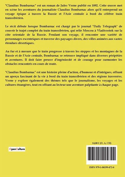 "Claudius Bombarnac" est un roman de Jules Verne publié en 1892. Cette ¿uvre met en scène les aventures du journaliste Claudius Bombarnac alors qu'il entreprend un voyage épique à travers la Russie et l'Asie centrale à bord du célèbre train transsibérien. Le récit débute lorsque Bombarnac est chargé par le journal "Daily Telegraph" de couvrir le trajet complet du train transsibérien, qui relie Moscou à Vladivostok sur la côte orientale de la Russie. Pendant son voyage, il rencontre une variété de personnages excentriques et traverse des paysages divers, des villes animées aux vastes étendues désertiques. Au fur et à mesure que le train progresse à travers les steppes et les montagnes de la Russie et de l'Asie centrale, Bombarnac se retrouve impliqué dans diverses péripéties et aventures. Il doit faire preuve d'ingéniosité et de courage pour surmonter les obstacles rencontrés en cours de route. "Claudius Bombarnac" est une histoire pleine d'action, d'humour et d'intrigues, offrant un aperçu fascinant de la vie à bord du train transsibérien et des régions traversées. Verne y explore également des thèmes tels que le journalisme, les voyages et les cultures étrangères, tout en offrant au lecteur une aventure palpitante à chaque page.