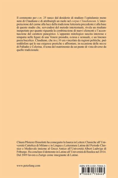 Il commento per "c.m." 25 nasce dal desiderio di studiare l'epitalamio meno noto di Claudiano e di attribuirgli un ruolo nel "corpus Claudianeum". L'interpretazione del carme alla luce della tradizione letteraria precedente è alla base di questo studio che, servendosi del metodo intertestuale, rivela un risultato inaspettato per quanto riguarda la combinazione di nuovi elementi e l'accentuazione del carattere panegirico. L'apparato mitologico suscita interesse e simpatia nelle figure di una Venere pronuba, oziosa e sensuale e un Imeneo poeta bucolico. Claudiano, che in c.10 era vincolato da ragioni politiche, può soddisfare qui le sue esigenze poetiche e affrontare, in occasione delle nozze di Palladio e Celerina, il tema del matrimonio da un punto di vista diverso da quello tradizionale.