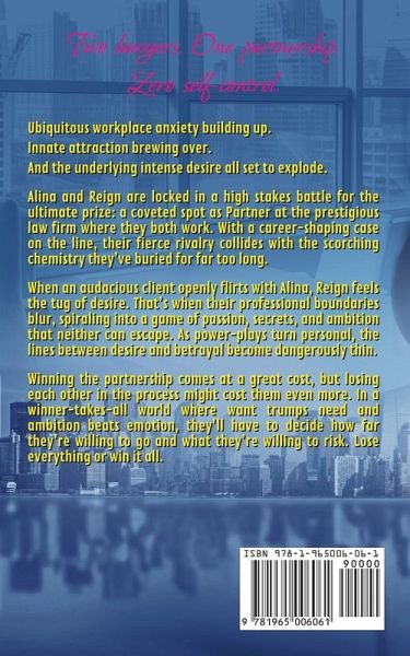 Two lawyers. One partnership. Zero self-control. Ubiquitous workplace anxiety building up. Innate attraction brewing over. And the underlying intense desire all set to explode. Alina and Reign are locked in a high stakes battle for the ultimate prize: a coveted spot as Partner at the prestigious law firm where they both work. With a career-shaping case on the line, their fierce rivalry collides with the scorching chemistry they've buried for far too long. When an audacious client openly flirts with Alina, Reign feels the tug of desire. That's when their professional boundaries blur, spiraling into a game of passion, secrets, and ambition that neither can escape. As power-plays turn personal, the lines between desire and betrayal become dangerously thin. Winning the partnership comes at a great cost, but losing each other in the process might cost them even more. In a winner-takes-all world where want trumps need and ambition beats emotion, they'll have to decide how far they're willing to go and what they're willing to risk. Lose everything or win it all. Perfect for fans of 'Suits' or the sizzling books of Sylvia Day and K.A. Tucker. This novella delivers raw emotion, smoldering desire, and a charming story that will keep you hooked until the final verdict.