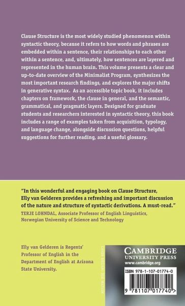 Clause structure is the most widely-studied phenomenon within syntactic theory, because it refers to how words and phrases are embedded within a sentence, their relationships to each other within a sentence, and ultimately, how sentences are layered and represented in the human brain. This volume presents a clear and up-to-date overview of the Minimalist Program, synthesizes the most important research findings, and explores the major shifts in generative syntax. As an accessible topic book, it includes chapters on framework, the clause in general, and the semantic, grammatical and pragmatic layers. Designed for graduate students and researchers interested in syntactic theory, this book includes a range of examples taken from data acquisition, typology and language change, alongside discussion questions, helpful suggestions for further reading and a useful glossary.